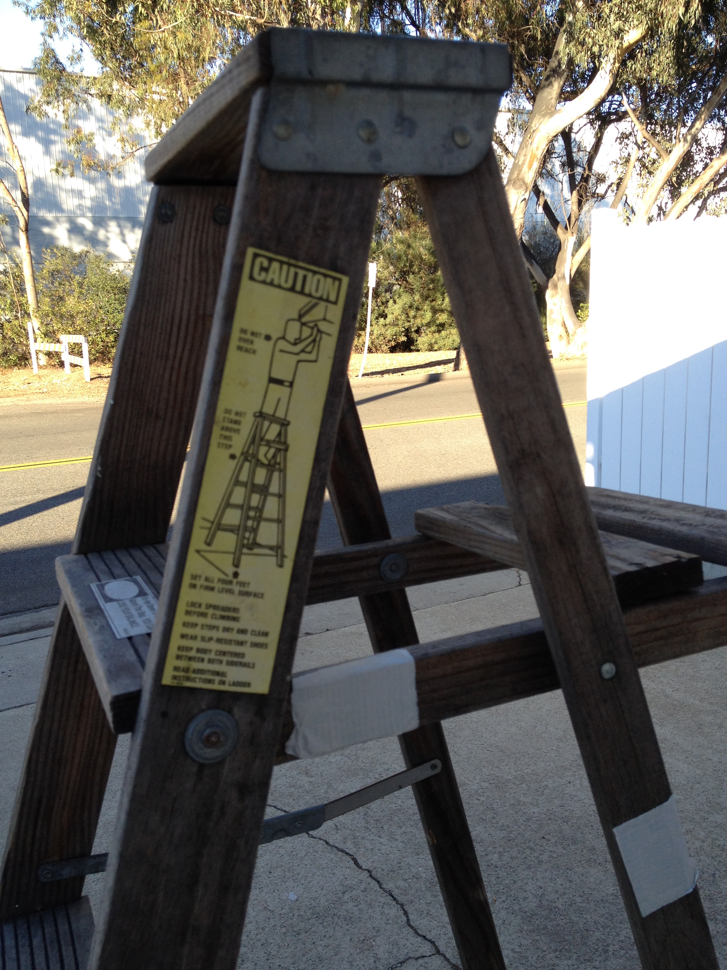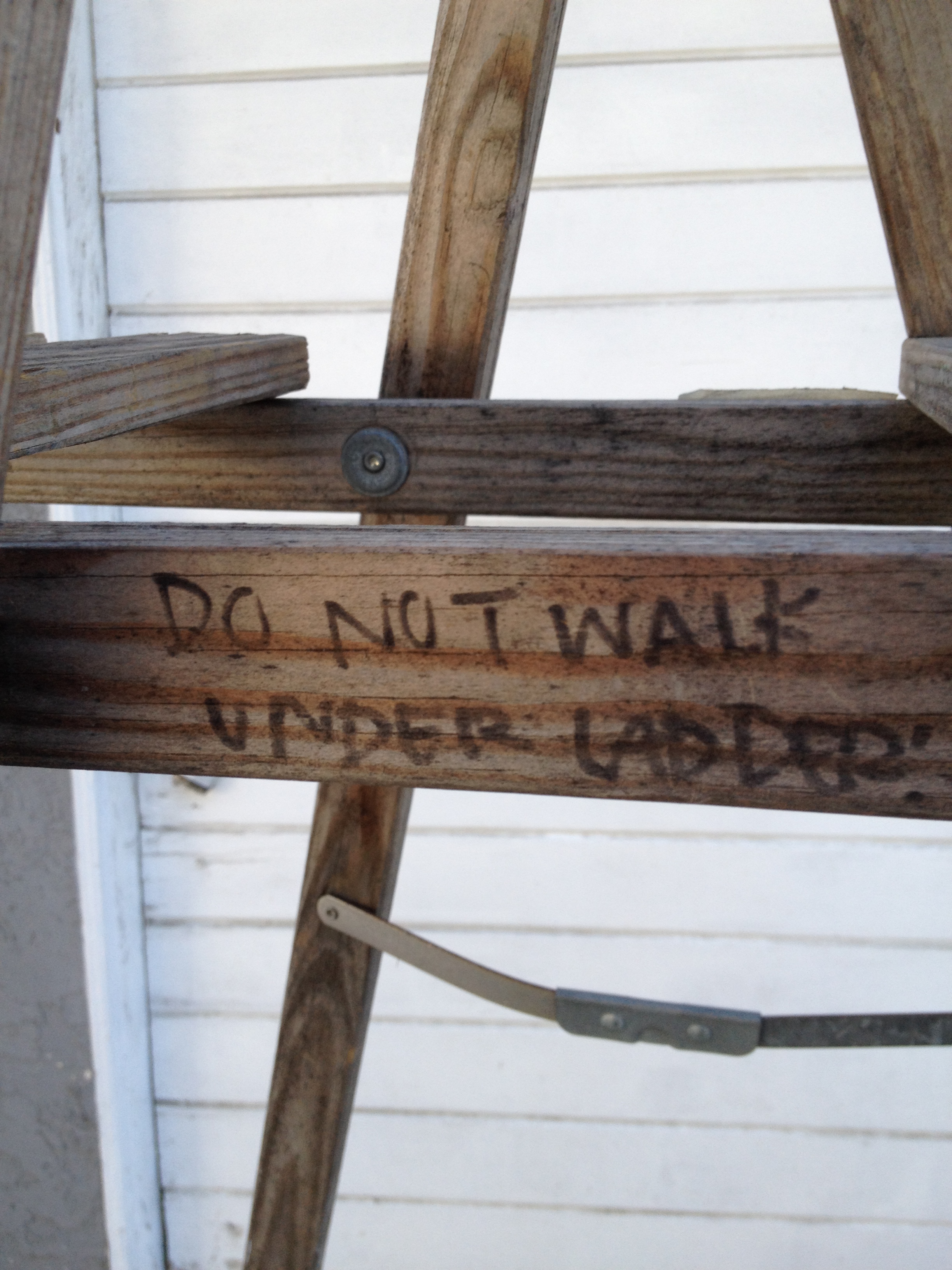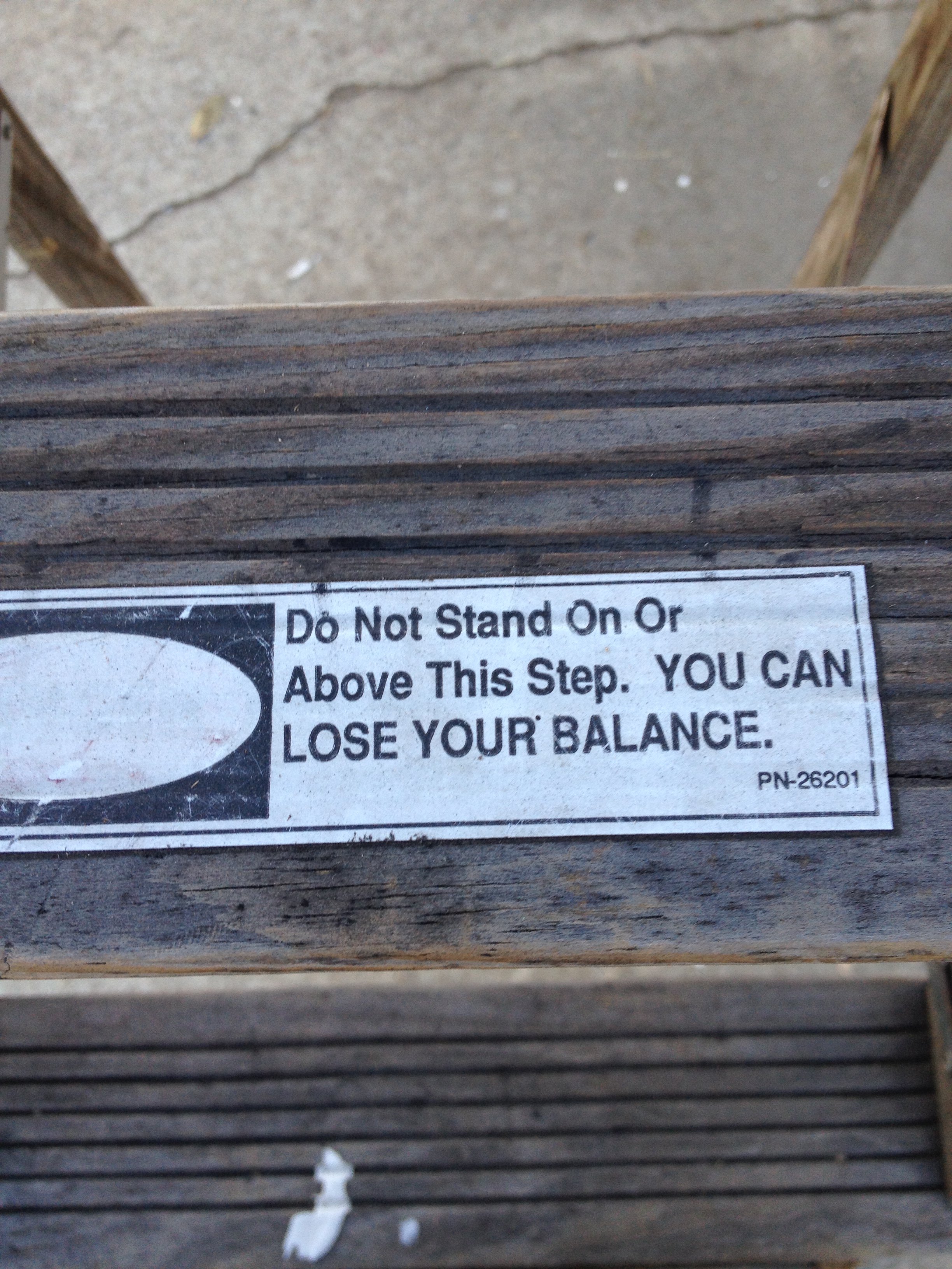 Of course, the bossy ladder company had to get into the act with their own art/literary work. Let me just say, the warning on the right means absolutely nothing to me. No ladder company is going to tell me where I can stand on my own ladder. Plus, this ladder is so old and so shaky, I’m pretty sure standing on the lowest step is probably just as dangerous as standing on the highest step. So it really doesn’t matter anymore. Anyone who uses this ladder (i.e., me) is taking his life into his hands.