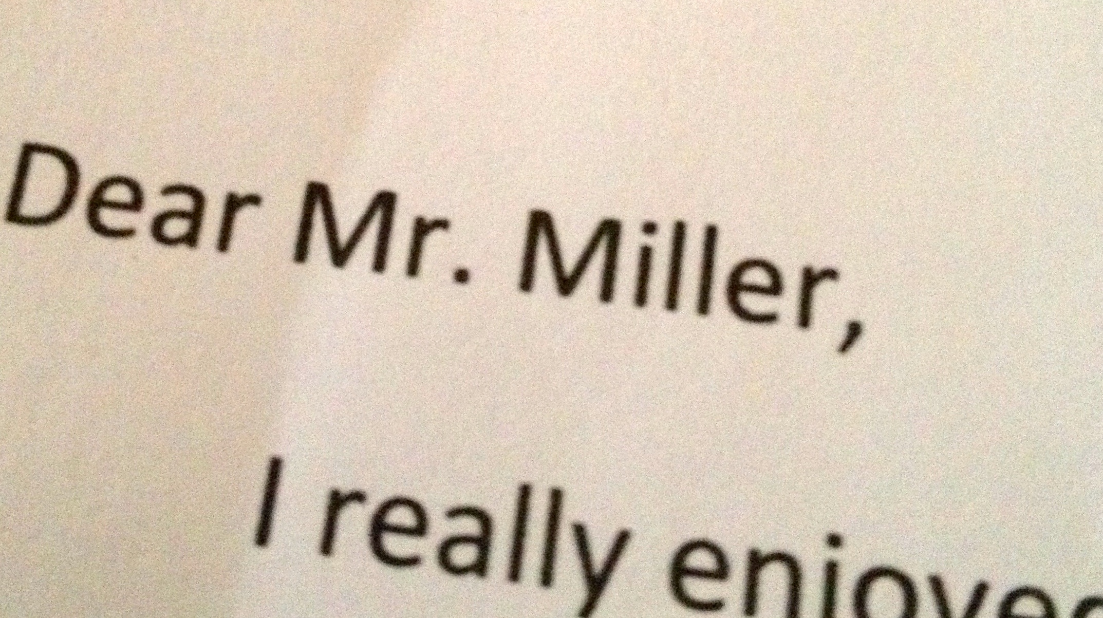 Dear Mr. Miller…. You have really done something with your life and I would love to help someday. Making kids that don’t have that much happy would make me feel so noble inside. I really appreciate you opening up my eyes to a whole different world.